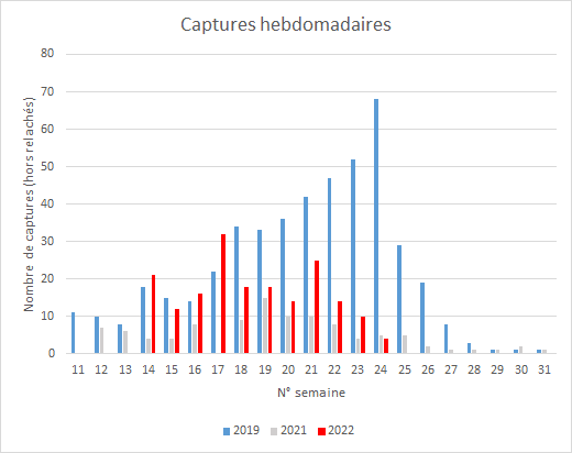 Comme le montre le graphique suivant, les captures semblent ralentir depuis deux semaines, alors qu’en 2019 la fréquence de captures atteignait son pic à la même période.